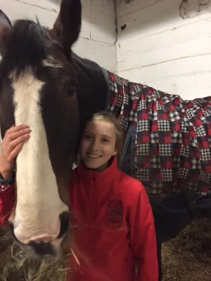 Sue’s favourite horse is Bud because according to her, he is “such a big, gentle goofball” and “he has been a lovely horse for CC to start riding with”. Bud also relates to Sue’s favourite memories of Lancers. She explained that when CC did her first training show, there was a mix up in who was riding Bud before her, and she had to scramble to get him ready. She remarked, “the older girls stepped in to help right away, and they were so amazing. I thought, ‘wow, this is a special place’”. In that vein, according to Sue, her favourite part about Lancers is “the sense of camaraderie that the riders have”. She added, “everyone helps me each other. It’s awesome. And it’s incredibly cool to get to hang out with the horses!” It is pretty evident that Sue enjoys her time at Lancers. When we asked how it compares to other volunteer opportunities in her life, she humorously responded, “like all my favourite volunteer experiences, it doesn’t feel like work. It’s fun to be around the barn. And, oh yeah, there’s a little more slobber”. It is highly likely that there will be a lot more horse slobber in Sue’s future. She said, “since I don’t expect CC to reduce her time in the barn, I see myself getting quicker at cleaning out stalls”.